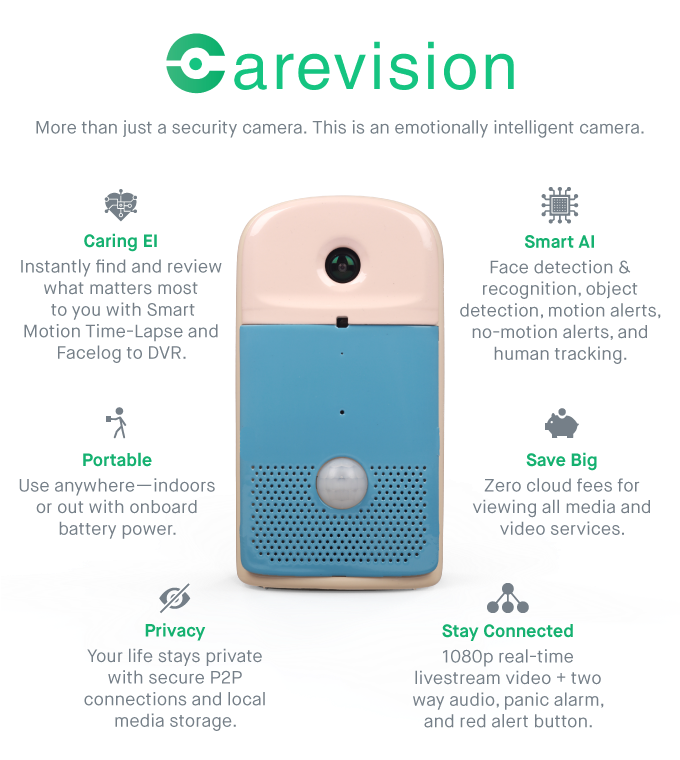 Back us and own the world’s first AI/EI camera and help us revolutionize smart cameras. Our next product will be a Carevision hub that will work with your existing cameras and give you the same fantastic features.